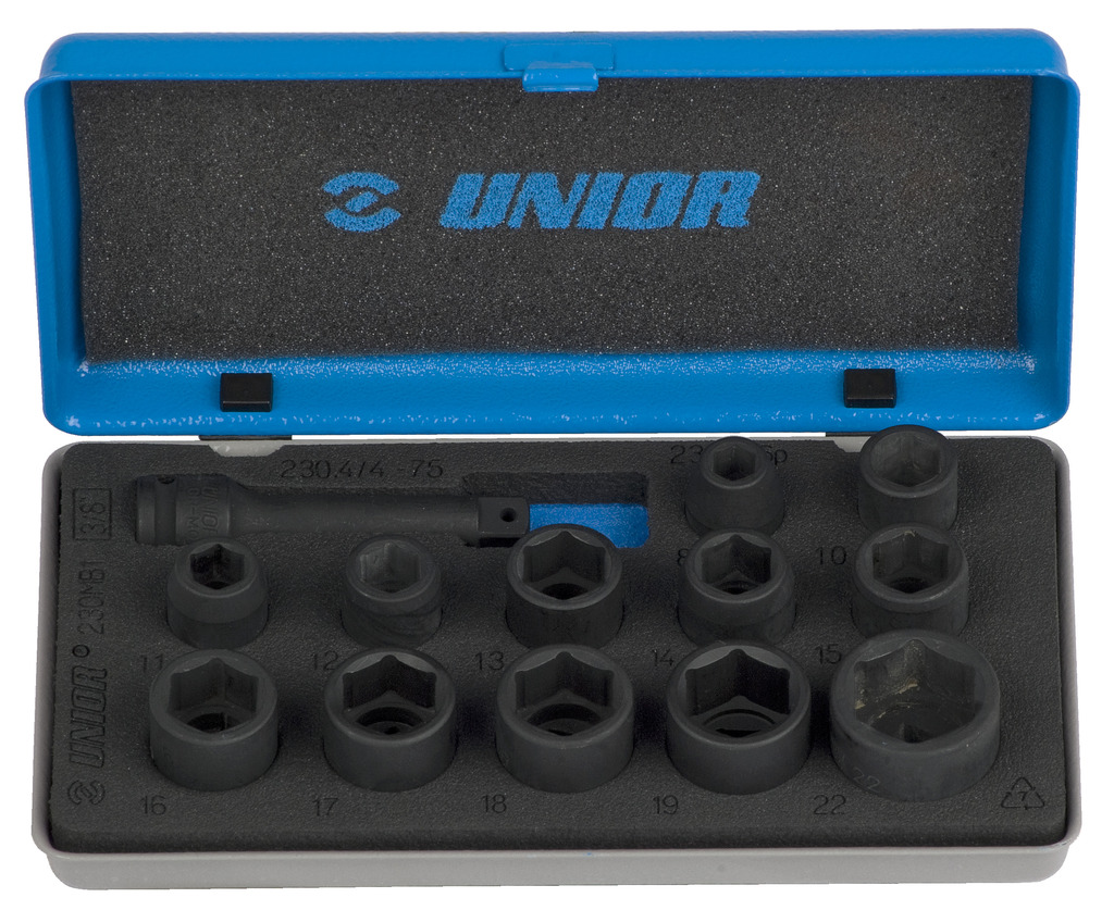 | Juego de vasos y accesorios de 3/8" de impacto en caja metálica | 612590 | 8 - 22 | 16 | |||